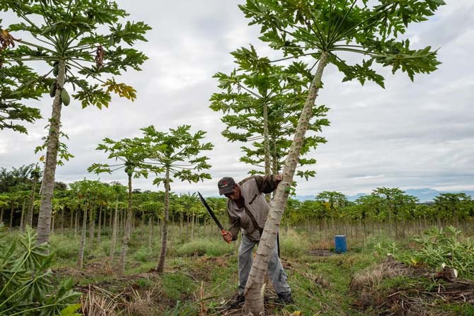 Con casi 60 años, el hijo de Mercedes Triviño, Jair, es uno de los trabajadores de más edad en los campos de papaya, pero no tiene ninguna queja. A pesar de que su trabajo es arduo, vivir en Ricaurte entre otros con síntomas similares le ha dado un grado de libertad que le costaría encontrar en otro lugar. Al final de su turno en un caluroso día de julio, Jair llena la parte trasera de una camioneta con fruta. Mueve las pesadas cajas una a una, con los brazos delgados pero fuertes hasta que ha acumulado casi 100. Se detiene para secarse el sudor de la frente y asegura la puerta del camión con un perno de hierro. El conductor enciende el motor mientras Jair se acomoda en la parte trasera. Jair dice que espera volver al día siguiente, «si así lo desea Dios».
